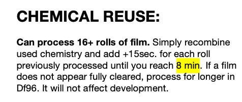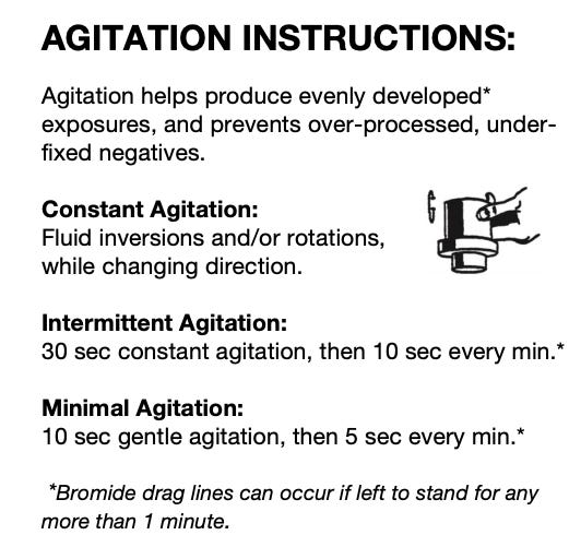 The second thing that surprised me is agitation. CineStill’s Df96 manual gives three recipes for fresh chemicals: