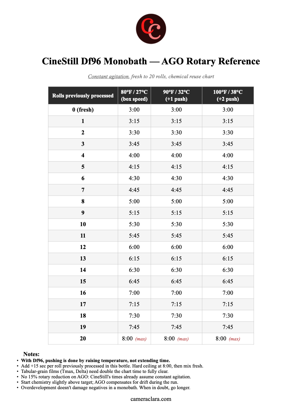 A CameraClara cheatsheet for Df96 on a rotary processor (AGO, Jobo, etc.)