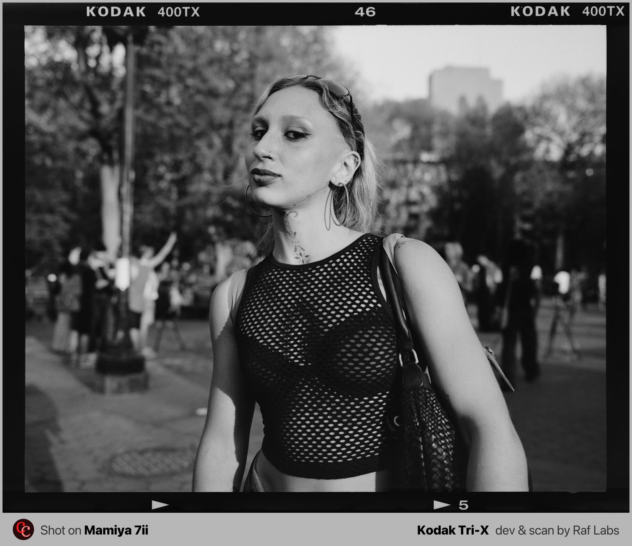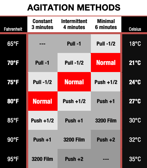 The CineStill Df96 monobath flips this logic around. The time is a checkpoint, not a knob. According to the manual, 3 minutes at 27°C/80°F is the minimum time needed for the developer to complete and the fixer to finish its job (with constant agitation [recommended]). In order to push the film a stop, you gotta raise the bath temperature by 10°F (about 6°C). Lowering the temperature pulls it.