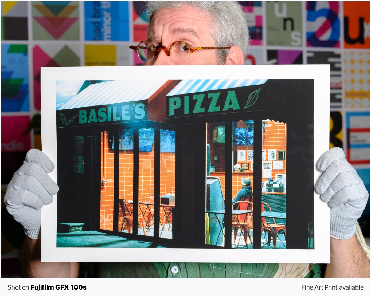 It was freezing cold. I had left a show in Brooklyn, and on my way back through Hoboken, New Jersey, I passed Basile’s Pizza. The warm glow stopped me in my tracks.