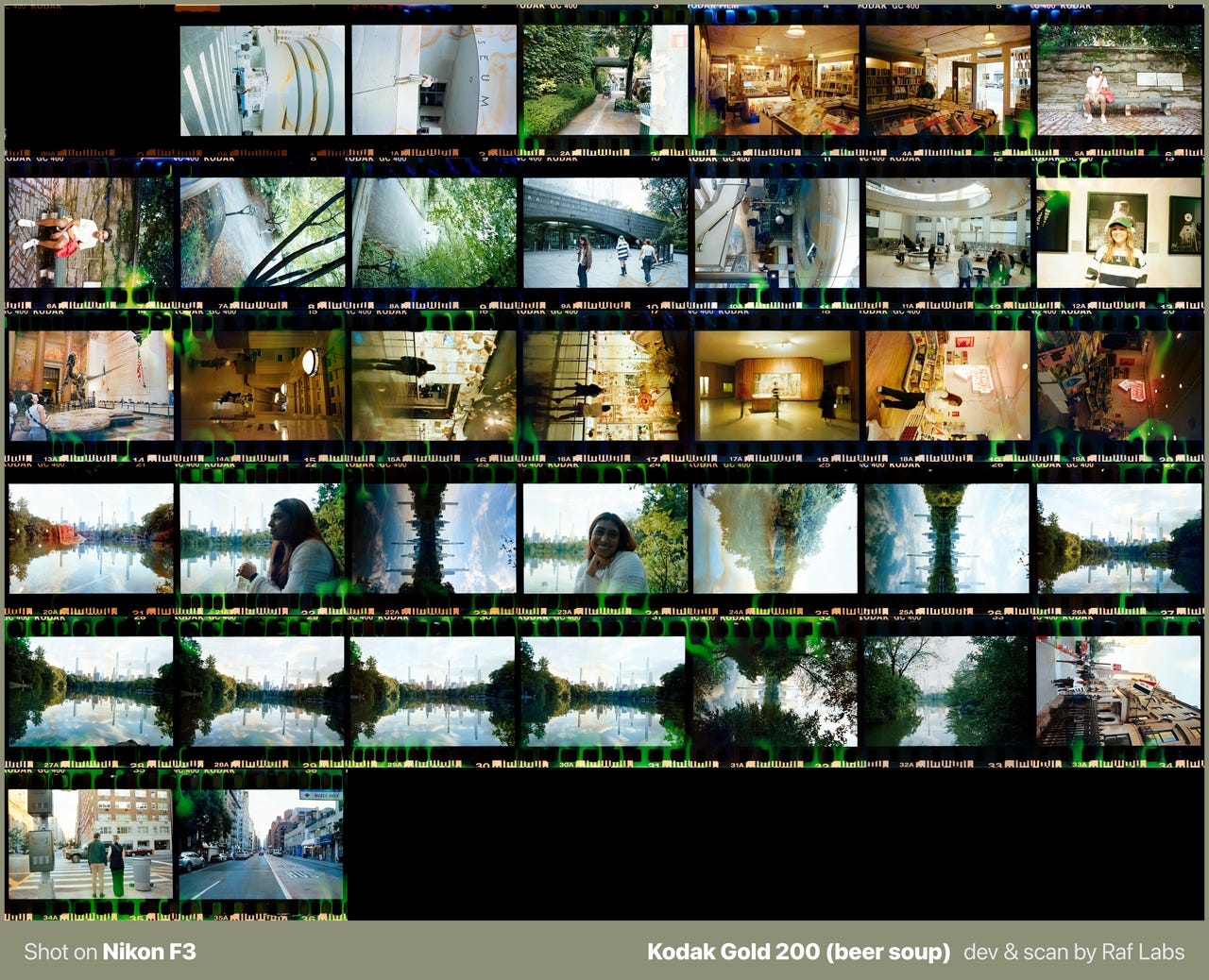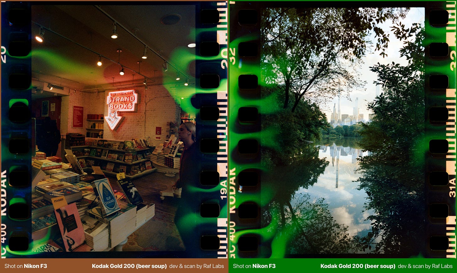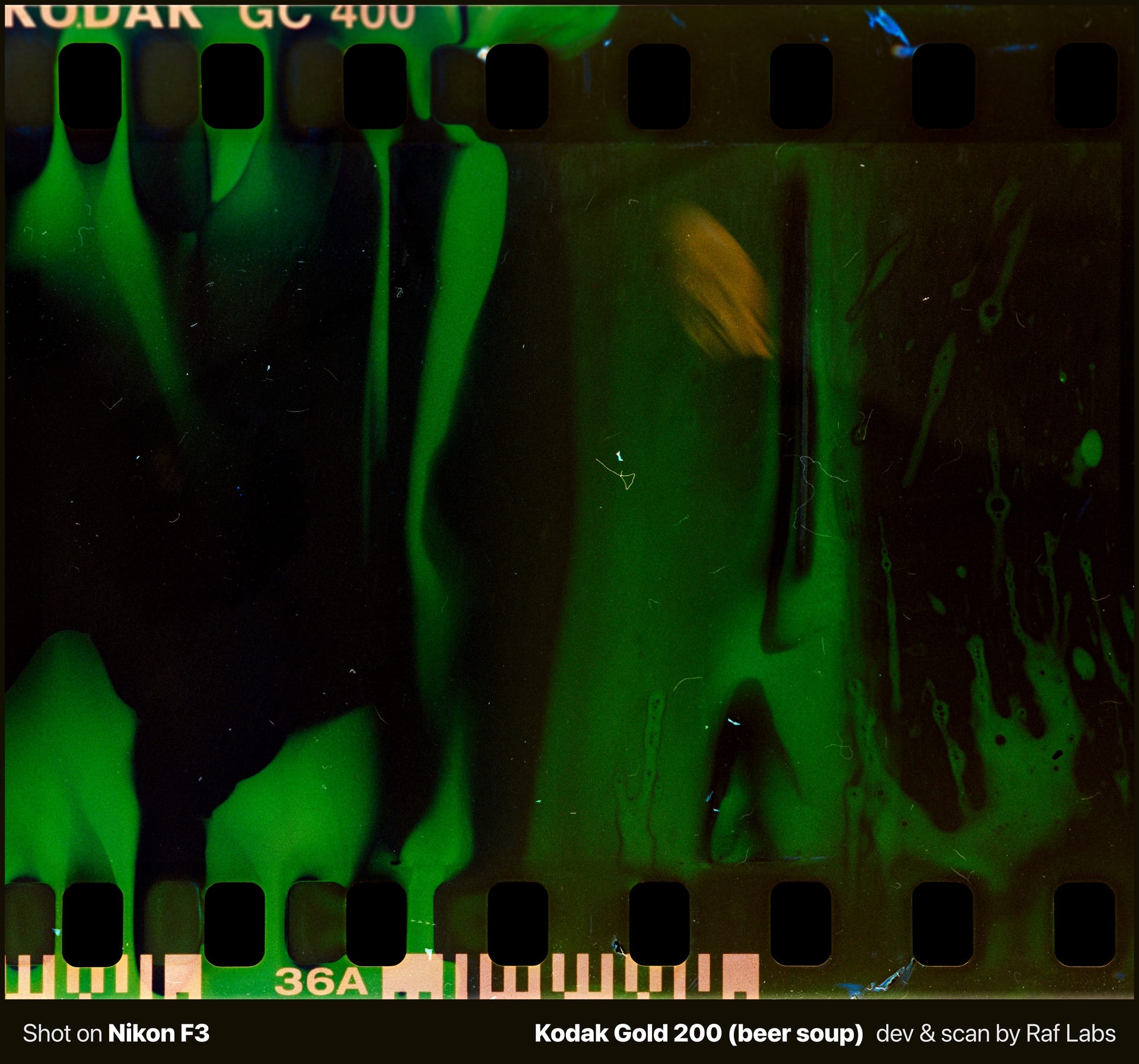 I recently collaborated with my friend Juno (@juno.fpv) on a beer soup experiment using two different film stocks: Kodak Gold 200 and Kodak Portra 400. Juno shot both rolls, and after souped them in beer, he was kind enough to have them developed at RafLabs. The results ranged from subtle orange halos to wild green patterns that look exactly like monstera plant leaves spreading across the film borders.