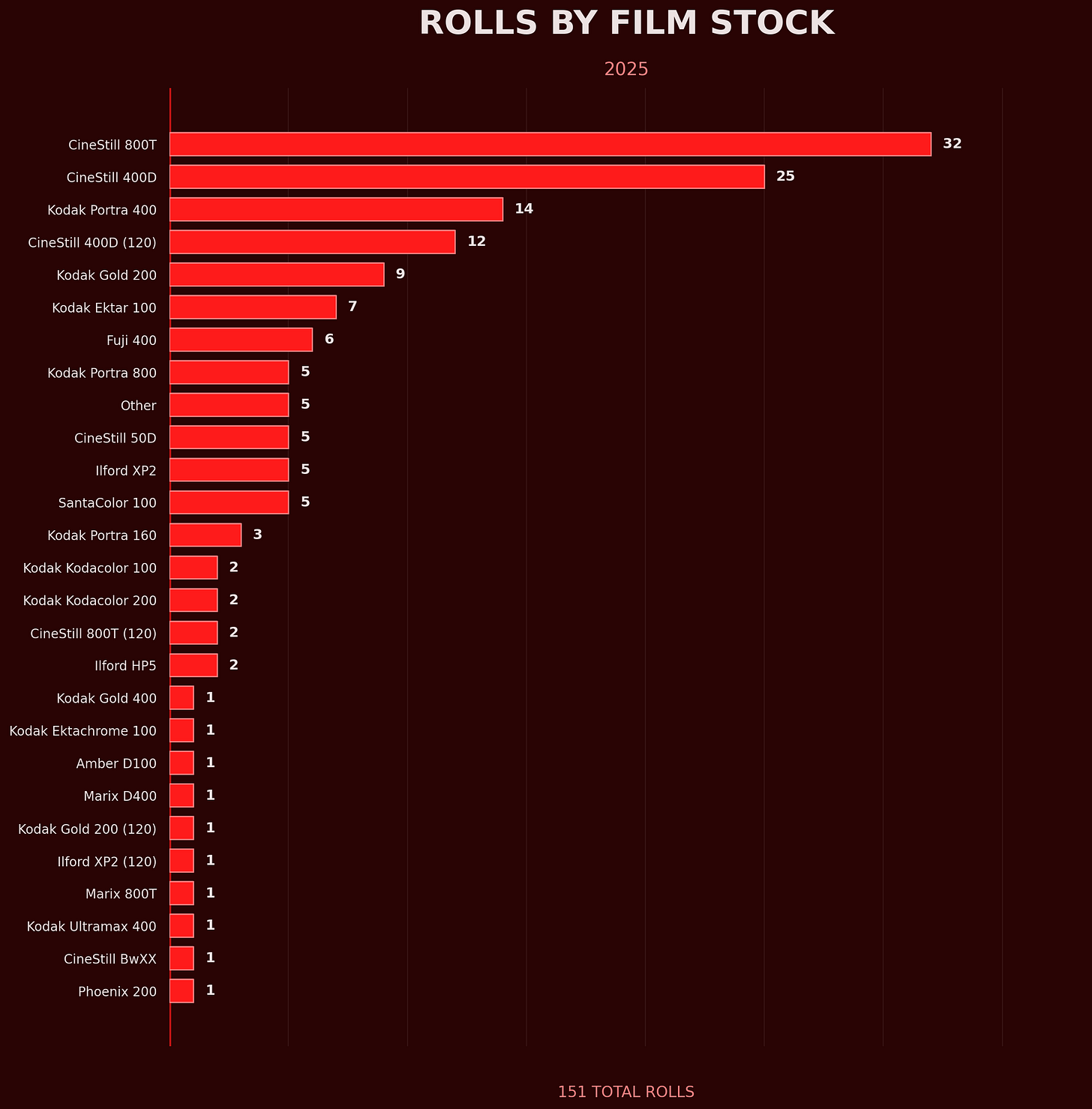 CineStill 800T dominated with 32 rolls, followed by CineStill 400D (25 rolls) and Kodak Portra 400 (14 rolls). The medium format CineStill 400D accounted for 12 rolls, while Kodak Gold 200 and Kodak Ektar 100 rounded out the top at 9 and 7 rolls.