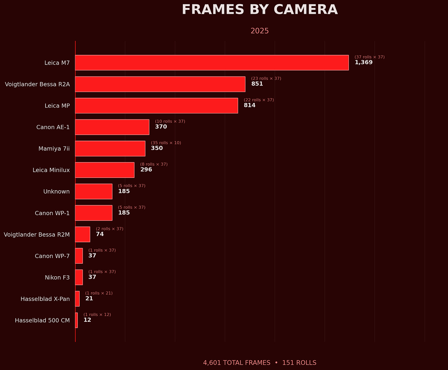 The Leica M7 saw the most action because it's the one I brought on my trip to Japan: 37 rolls, 1,369 frames. Its aperture-priority automation makes it my go-to for street shooting.