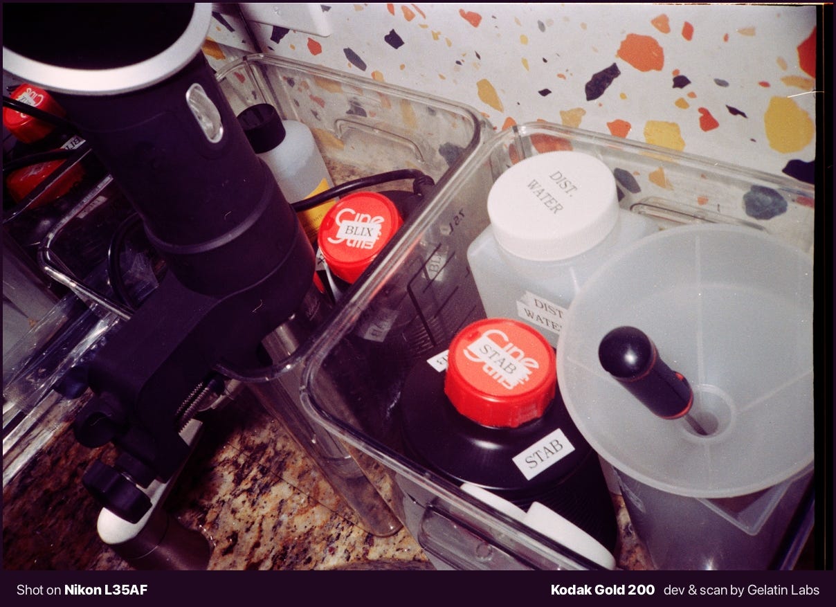 So I invested in Negative Supply equipment, a Fuji GFX for scanning, a sous vide machine, and an AGO Film Processor for consistent development. The AGO handles temperature control and agitation automatically, removing the variables that can ruin a roll. I could now process color negative film at home using CineStill C-41 chemistry for a fraction of what labs charge.