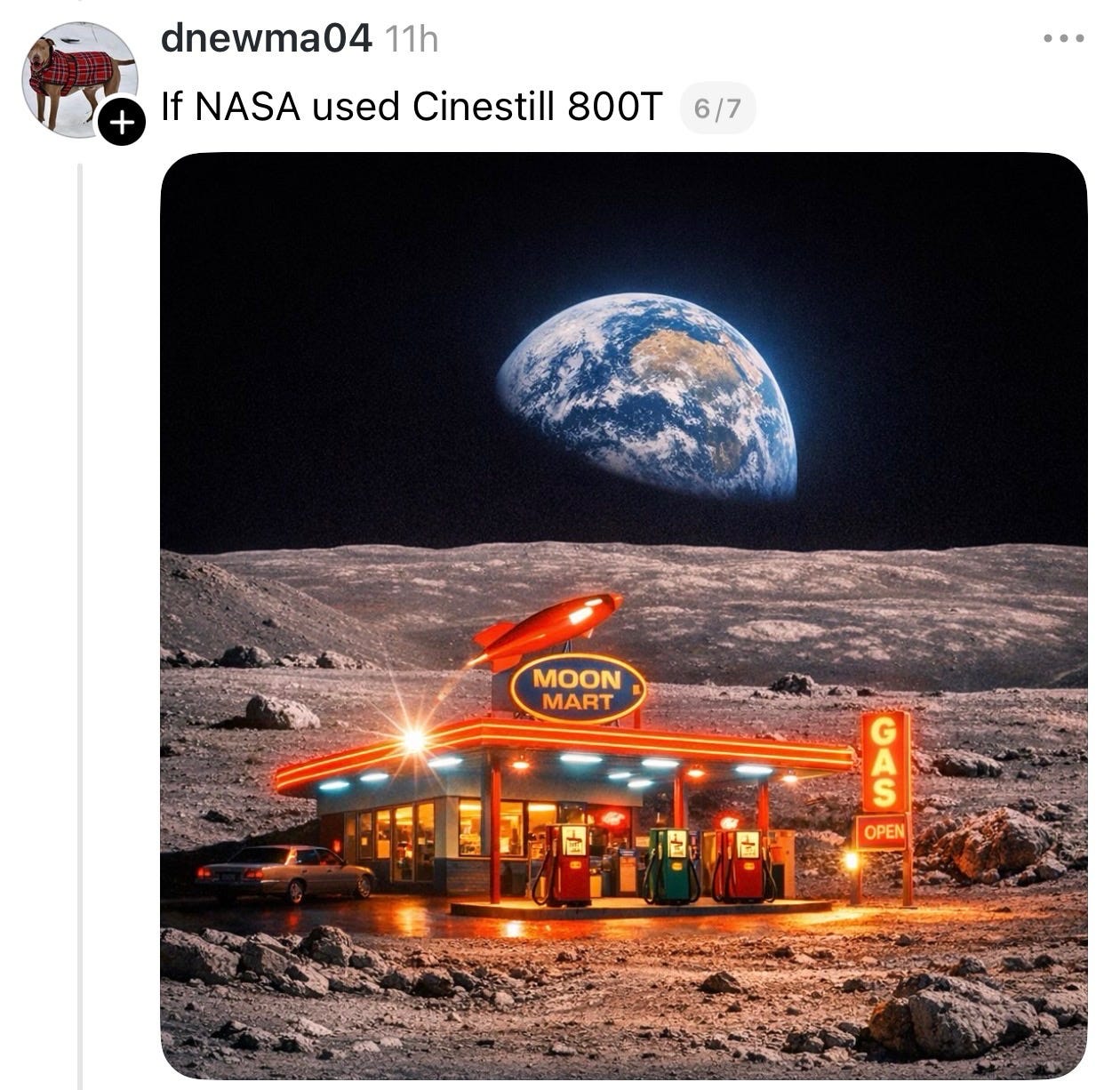 I shared my Japan mistake: 20 rolls of CineStill 800T, shot temples and snow in Sapporo. Cold and flat. There’s a meme: “If NASA used CineStill 800T,” and there’s a gas station on the moon. Because that’s what we do.