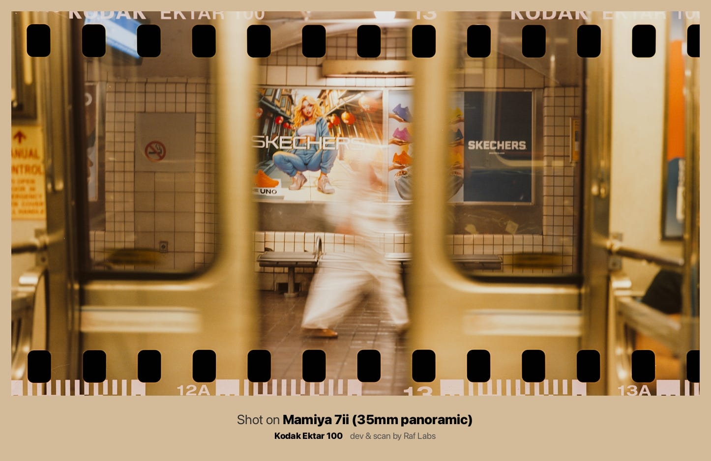 Back in NYC, I shot this with the panoramic kit on the Mamiya 7ii. I had Kodak Ektar 100 loaded, and without thinking about the low ISO, I just pressed the shutter. The slow film captured the motion blur of someone stepping through the half-open subway door. What I like about this frame is the ambiguity: you can’t tell if the doors are closing or opening, just that there’s movement. I also find it charming when the film borders extend into the image area like this. Related post here: