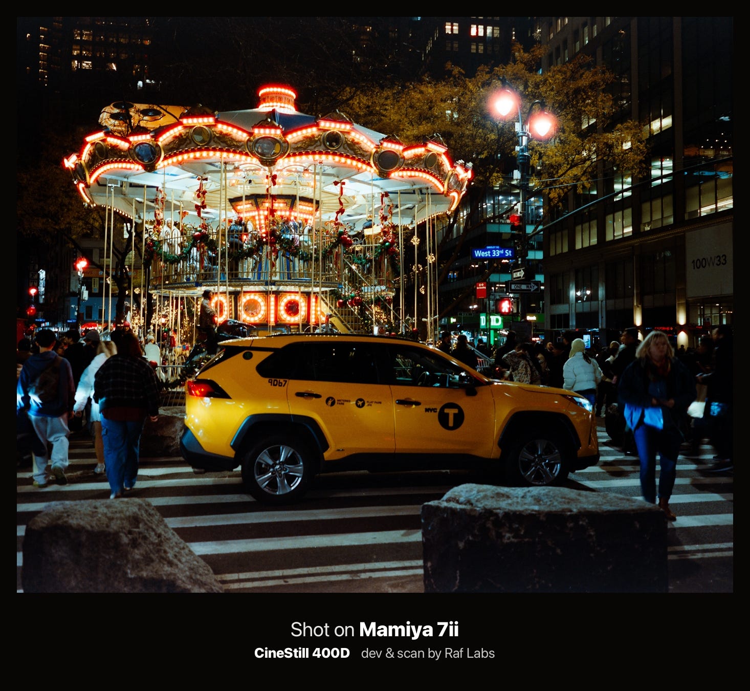 They installed this carousel near 33rd Street in Manhattan for the holidays. I brought the Mamiya and shot a full roll of it. This frame won because of the yellow cab passing through, cutting across the blur of a spinning thing dropped in the middle of the street.
