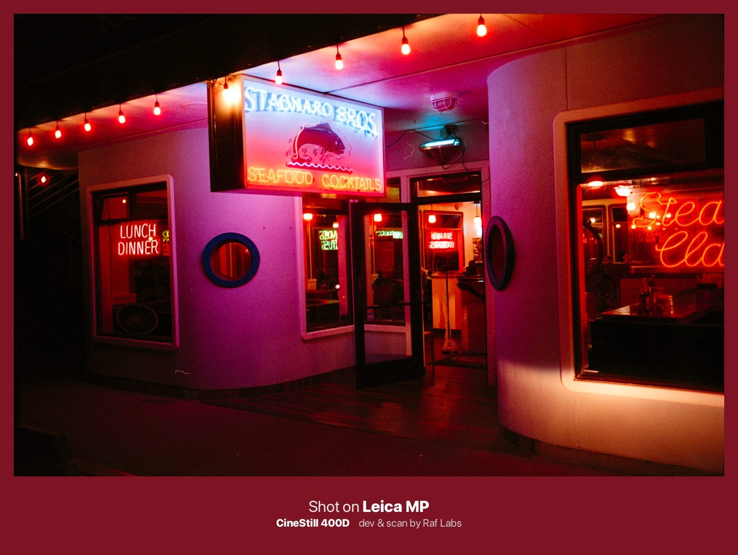 During a California trip full of CineStill, halation chasing, and neon lights from the van, I took this photo at the Santa Cruz Pier. I was walking with a friend on a warm night, and I pressed the shutter right before they shut the lights off. Timing is everything.