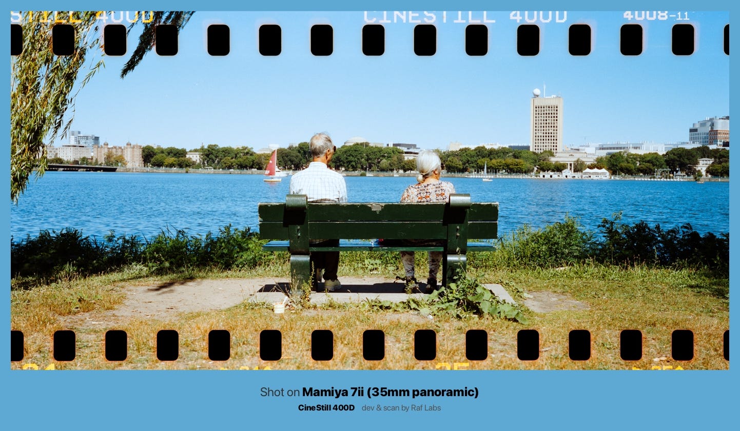 I took this one on a road trip to Boston, also using the panoramic kit for 35mm on a medium format camera. The muted colors are calming, fitting for a city that moves at a slower pace. These two stood up a second after I pressed the shutter. Lucky timing. I documented more shots from this trip here: