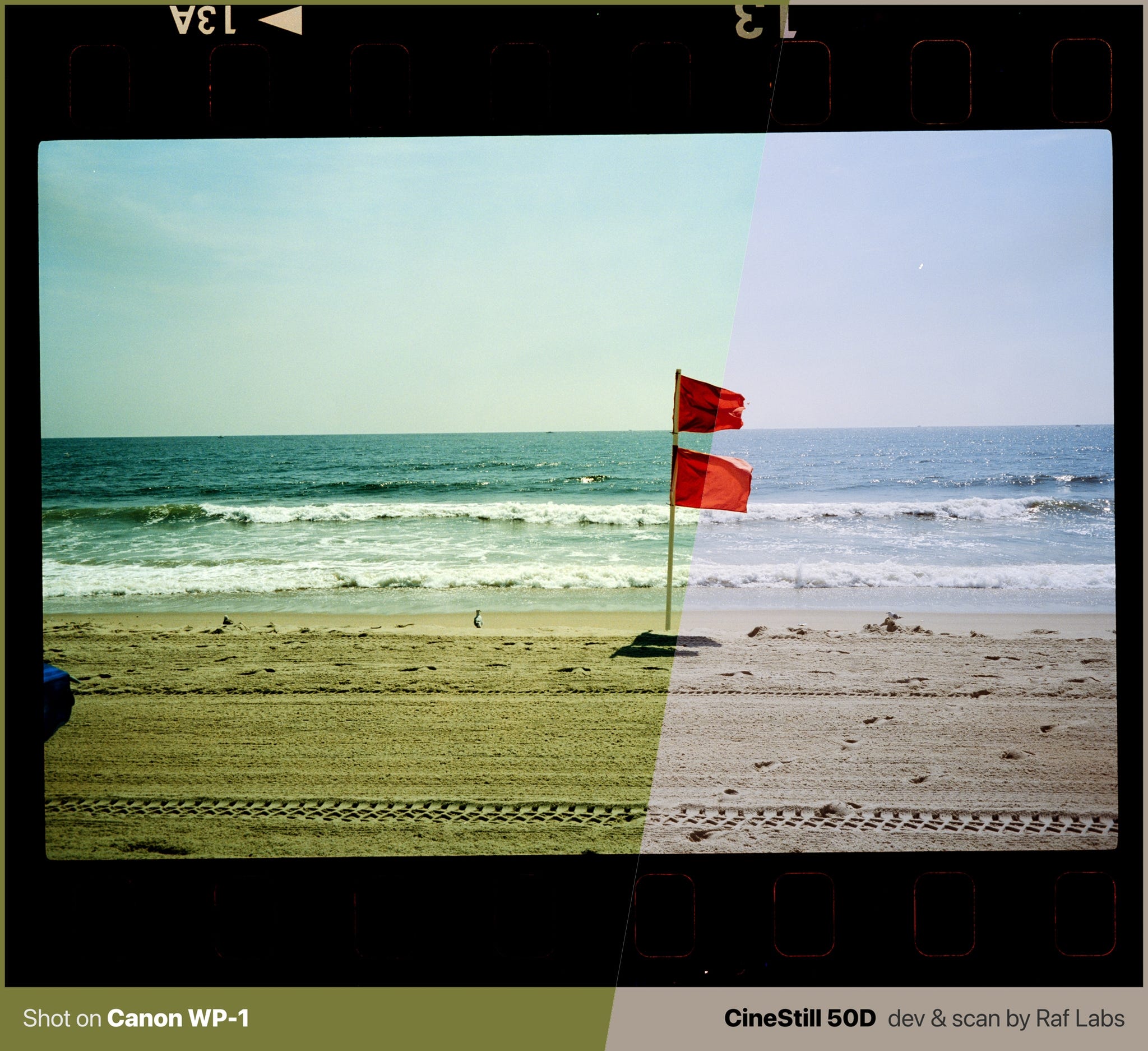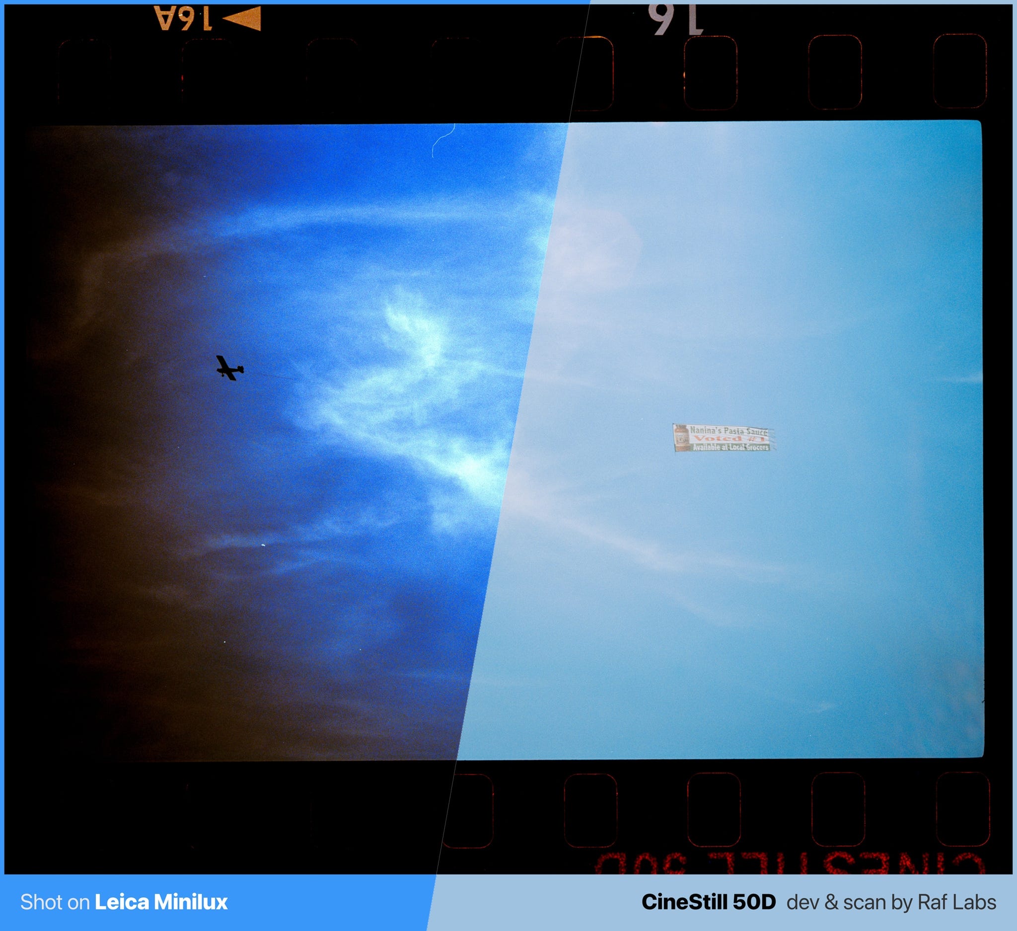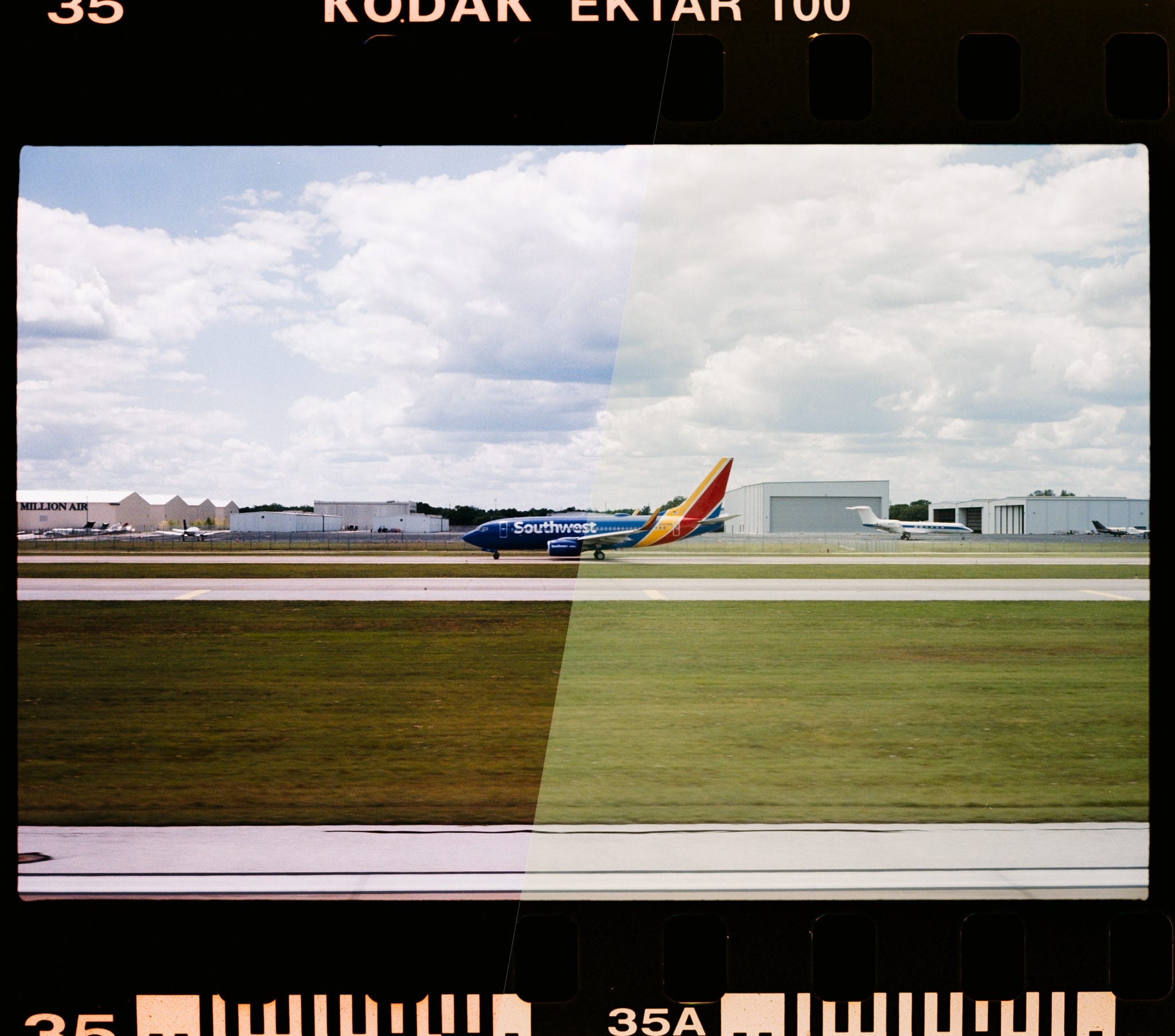 That amount of grain and the yellow-ish film border lettering defnitely doesn't well-represent Ektar 100. Same with the sky that was supposed to be light blue without the super strong vignetting and grain, especially for an ISO 50 film, like the CineStill 50D!! Although it might look nice, I don't want the shot looking like the below…