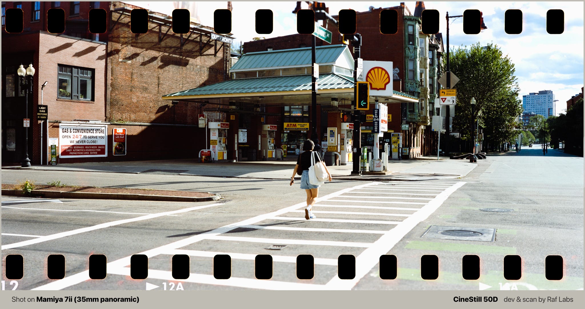 I was visiting Boston over the long Memorial Day weekend—a remarkably clean and affluent city. When I arrived that afternoon, I spotted a Shell gas station with a striking neon sign glowing behind it. The scene immediately triggered my photographer's instinct: I knew I had to return after dark with my CineStill 800T to capture that moment.