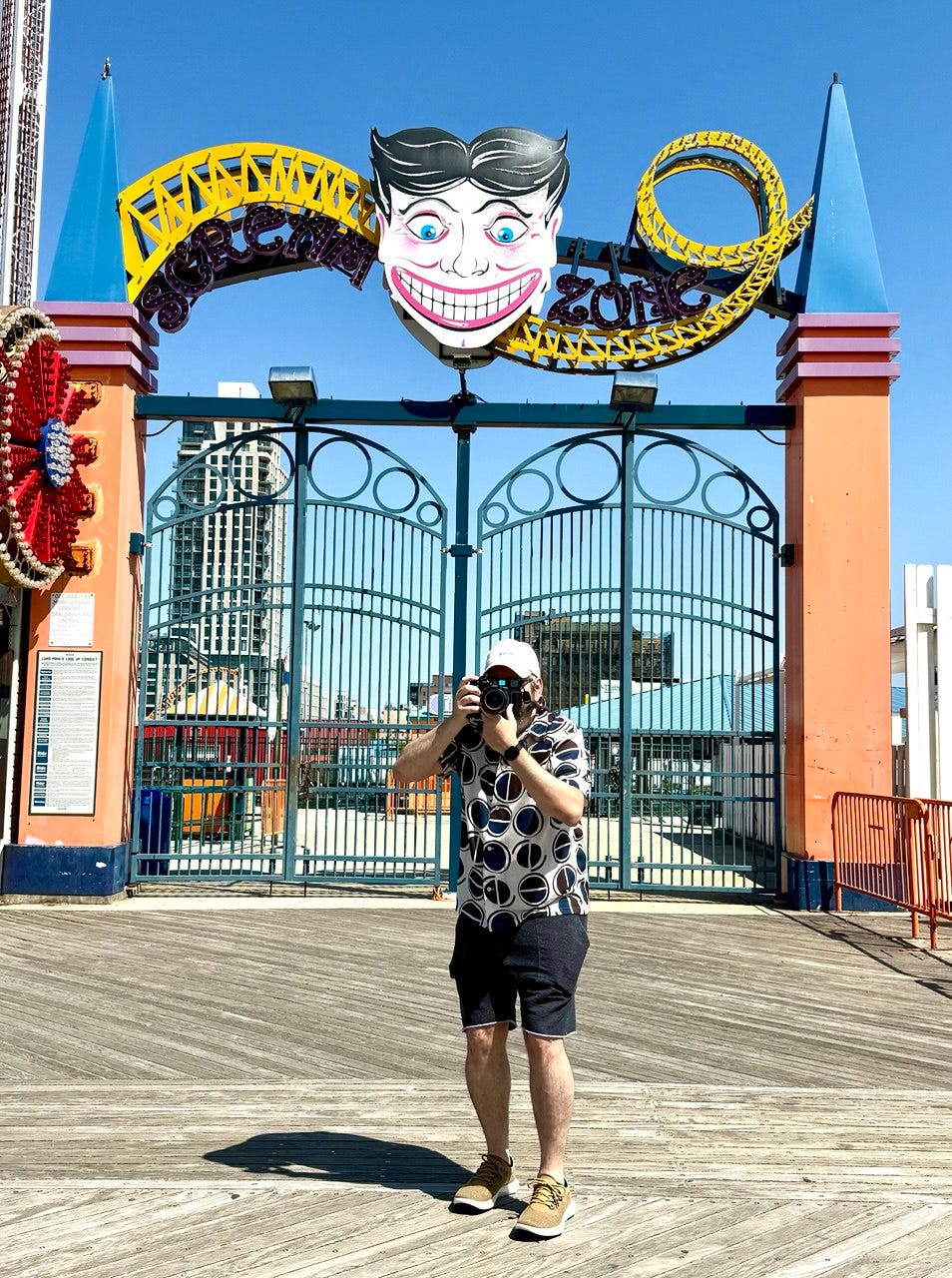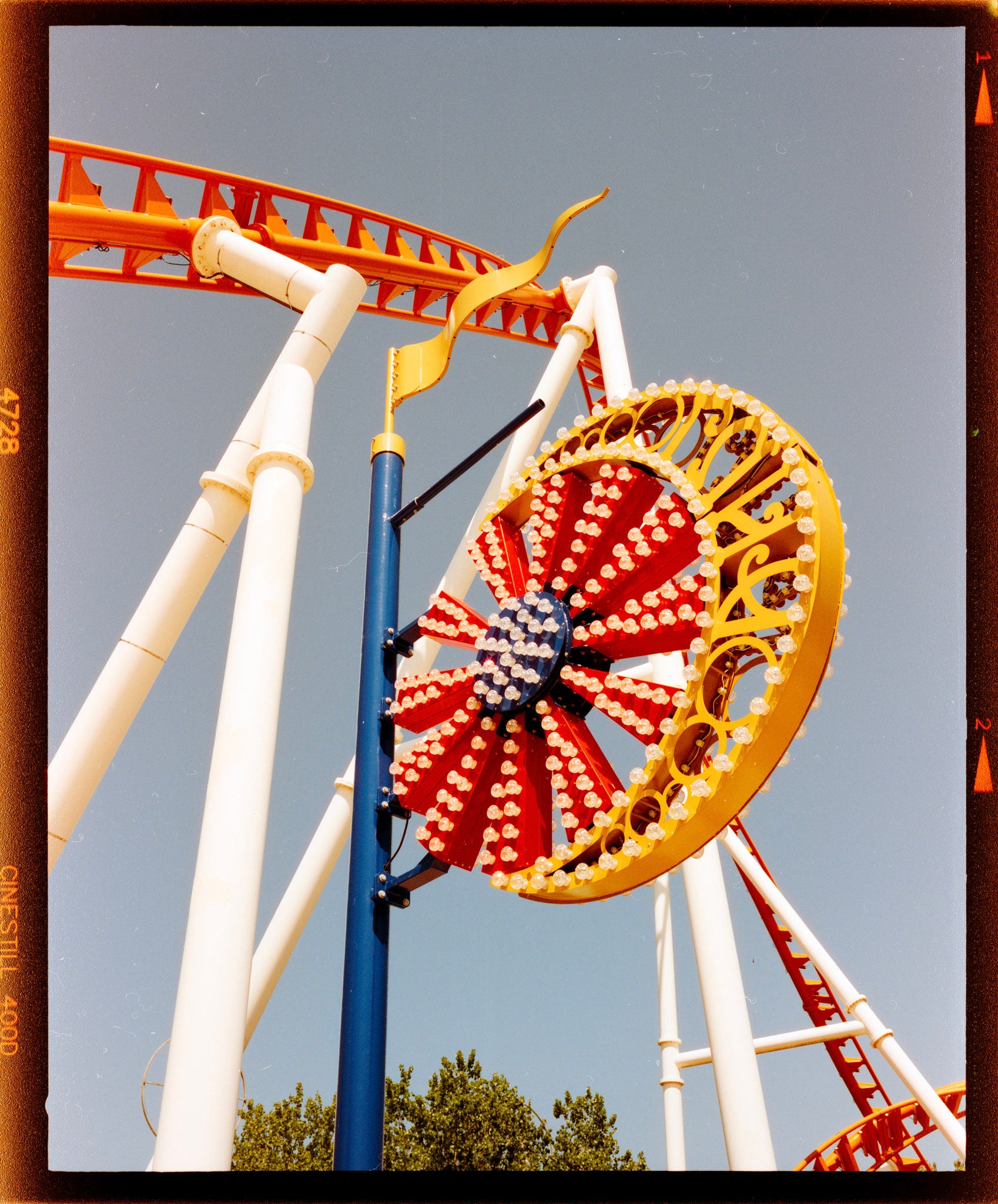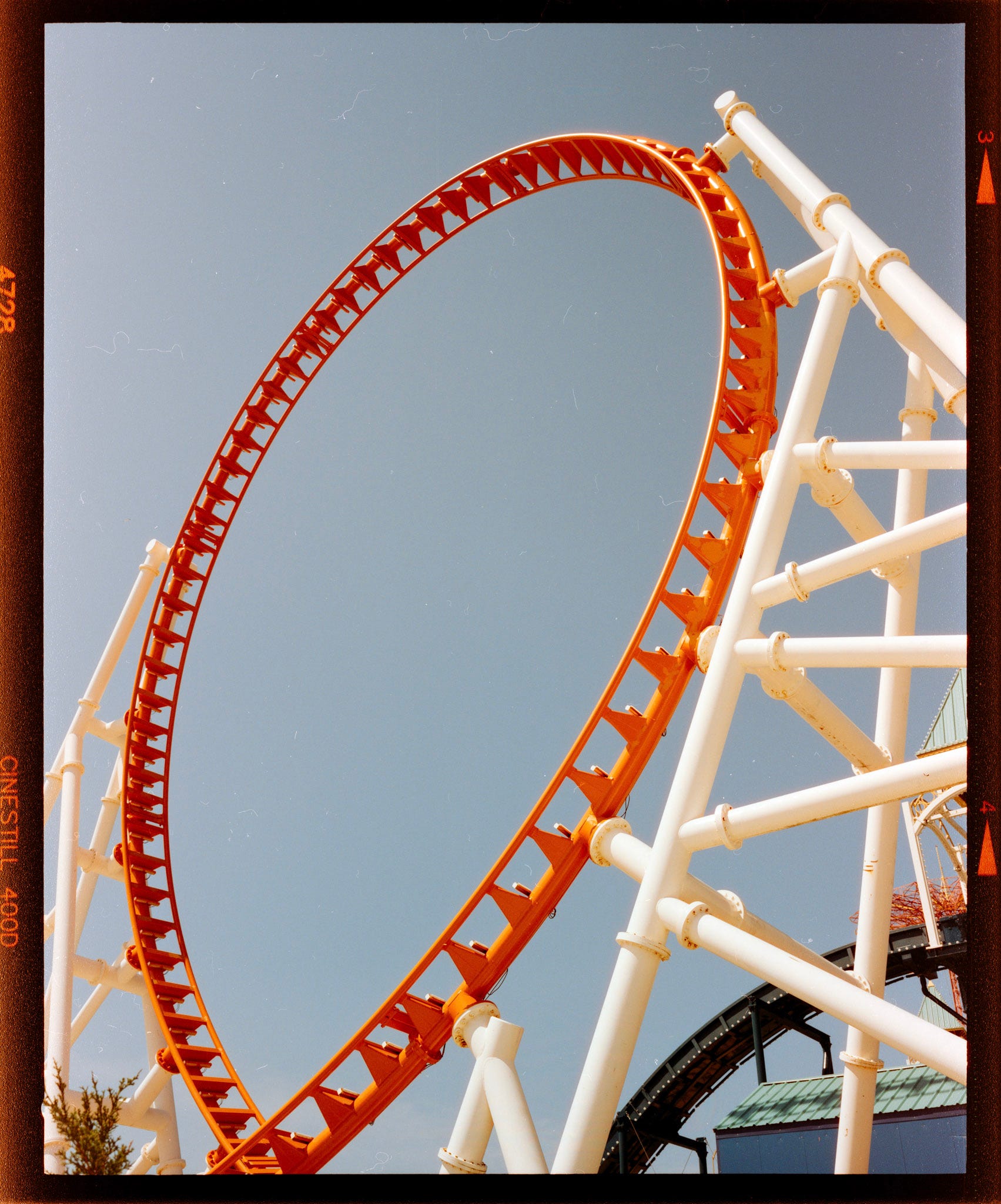 After walking 3 minutes, I proceeded to the park, accelerating my pace due to the anxiety of getting people in my shots, I wanted an empty area. I was photographing an attraction called Thunderbolt, when there was a boy riding his bike, he stopped and posed for me, and in a matter of literally 3 seconds, I scored this shot: