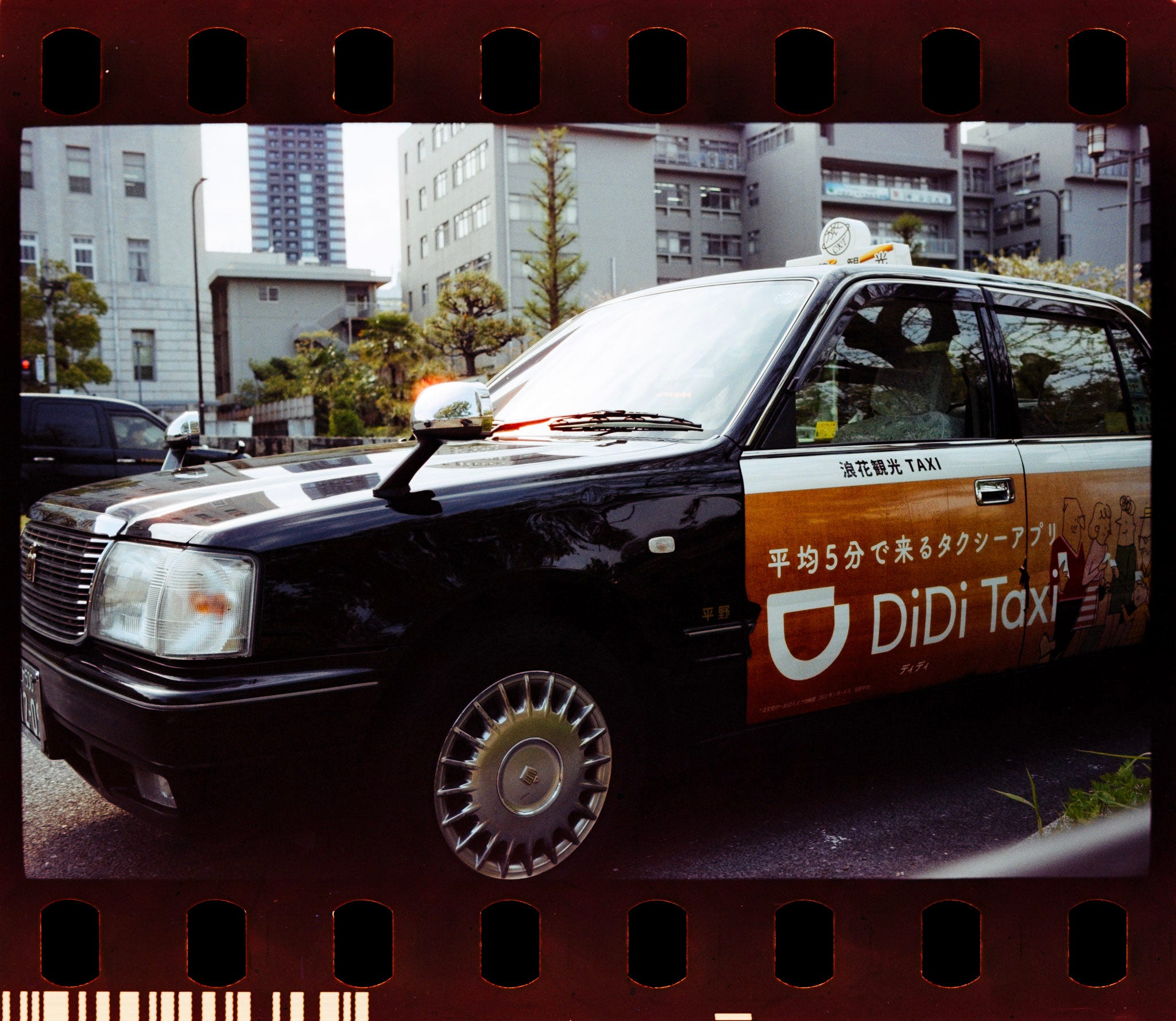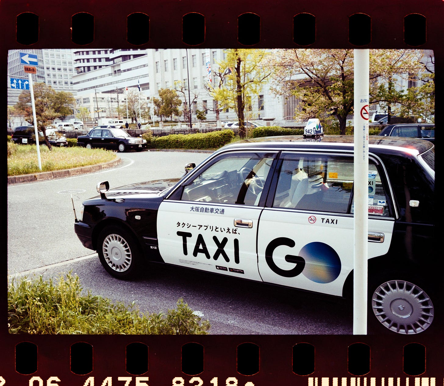 A gorgeous moment at Osaka Castle Outskirts, a Japanese, 27 exposures, ISO 100 film stock, daylight shots, and a couple of taxi cabs.