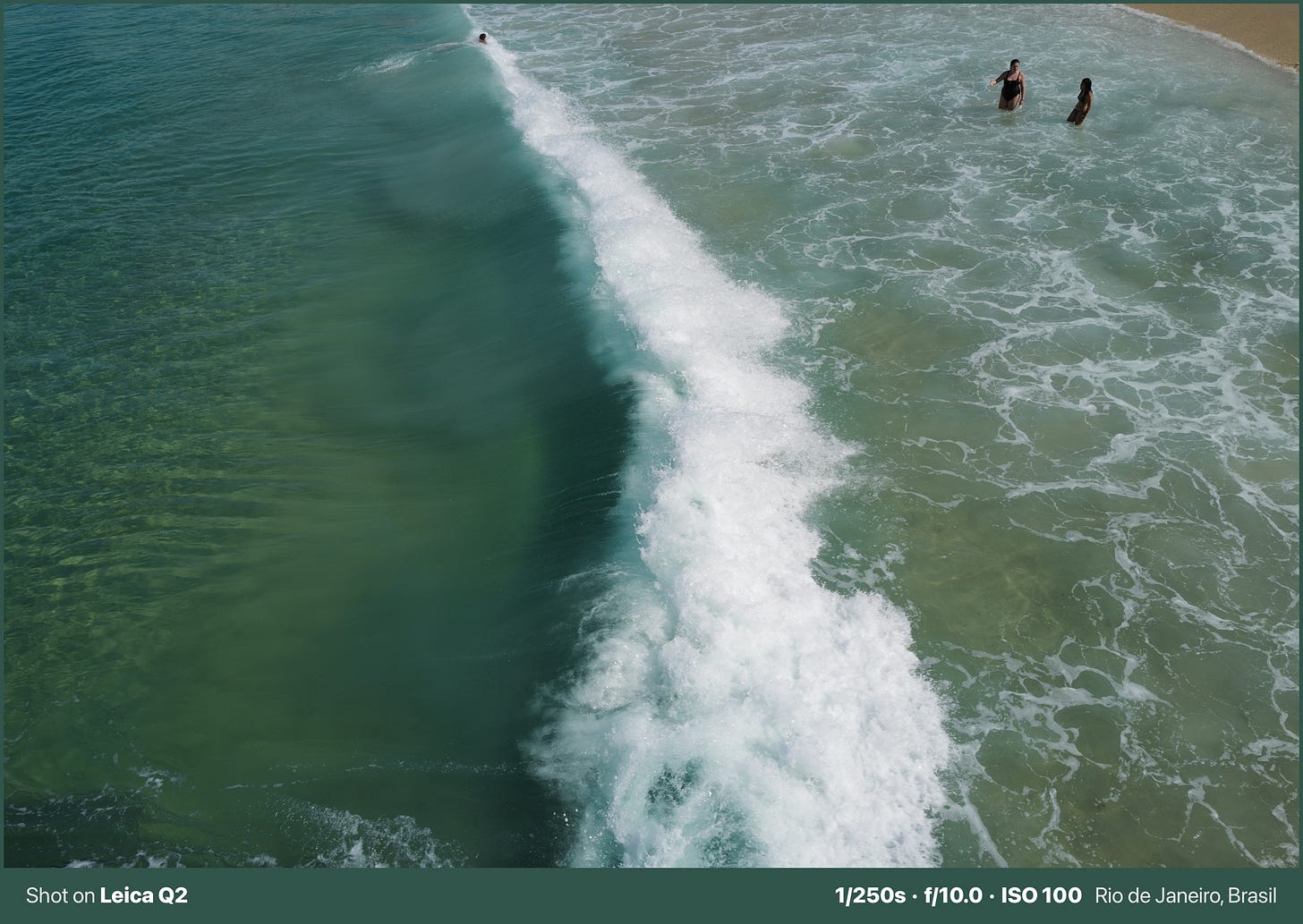 A single wave cuts through the light, dividing green from frothy white. One side rests, the other runs a sea that hums beneath the suns. Two figures float, one line in play, no wall, no rope, just salt and sway. No borders here, no rules to name, just water dancing all the same.