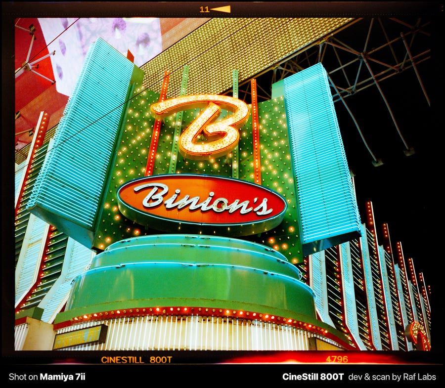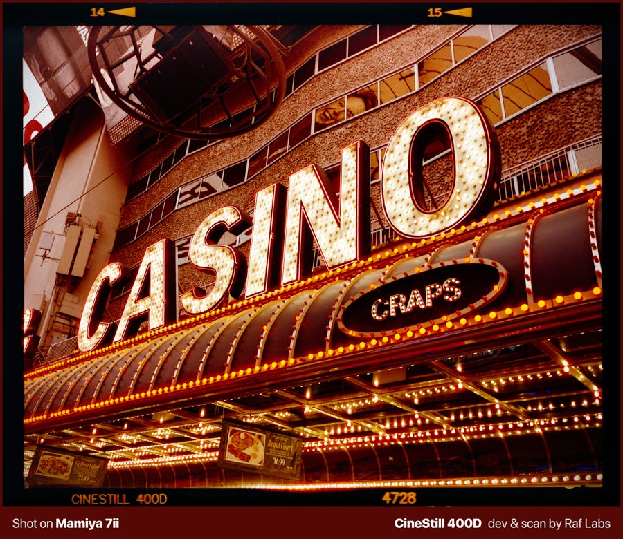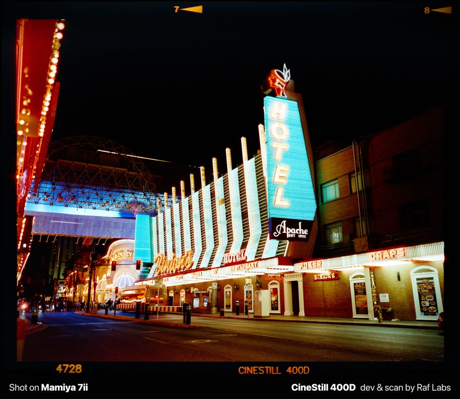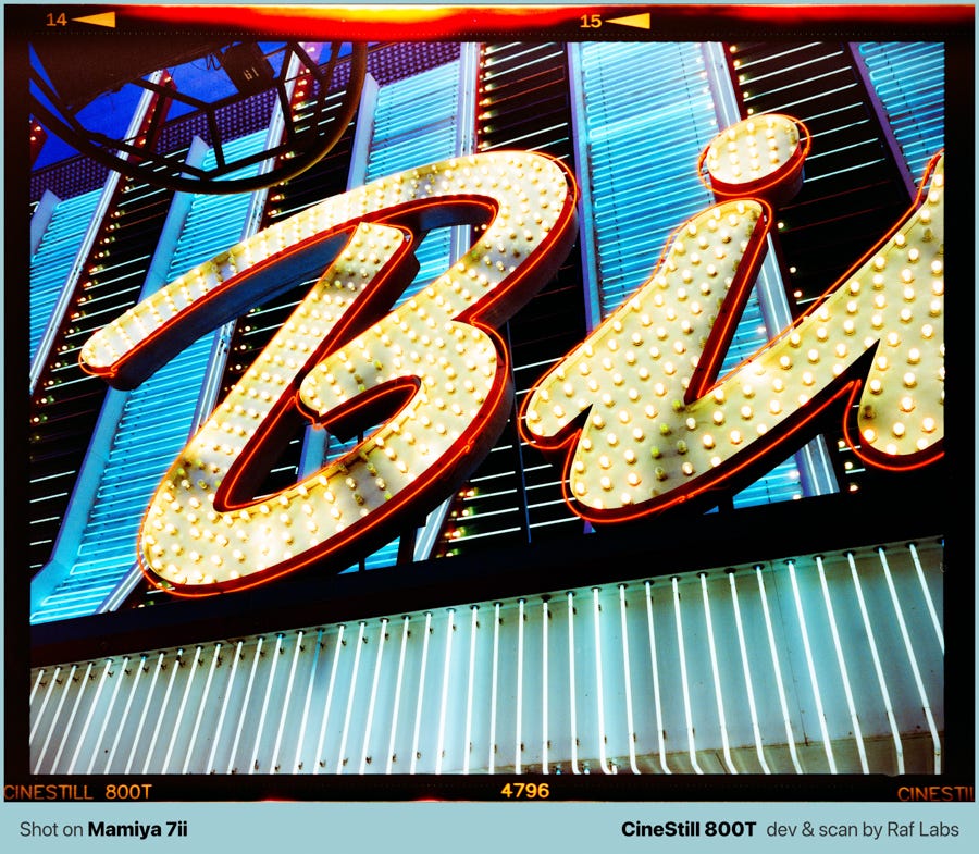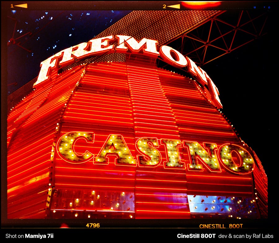 Film broke that habit by removing the option entirely. When I shot two rolls of medium format (6x7 at $1.50 per shot [self-developed!]) at Fremont Street in Las Vegas, I flew home across the country before seeing a single result, and the only thing I could rely on was my ability to read the scene with my eyes, but confident that I did a good job.