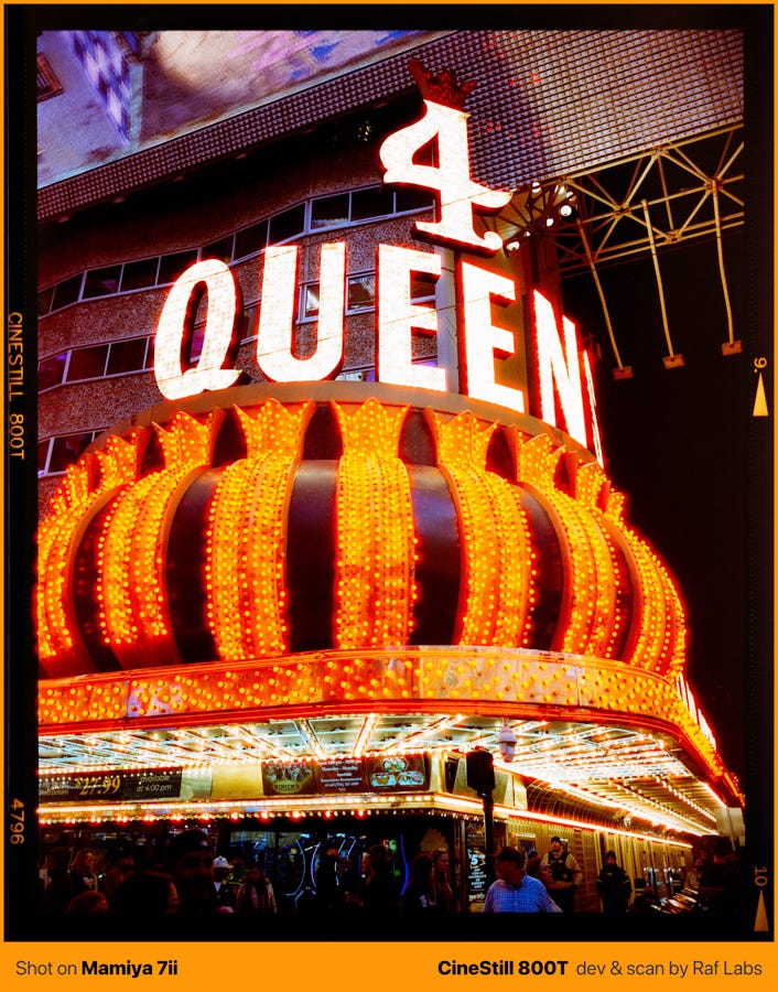 The skill came from a simple practice I started years ago: guessing the exposure before checking my meter, then comparing. After months of being off by two or three stops, I started recognizing lighting conditions instinctively. That training paid off at Fremont Street, where my camera’s meter was not trustworthy, as neon signs flash on and off, cycle through patterns, change intensity every few seconds.