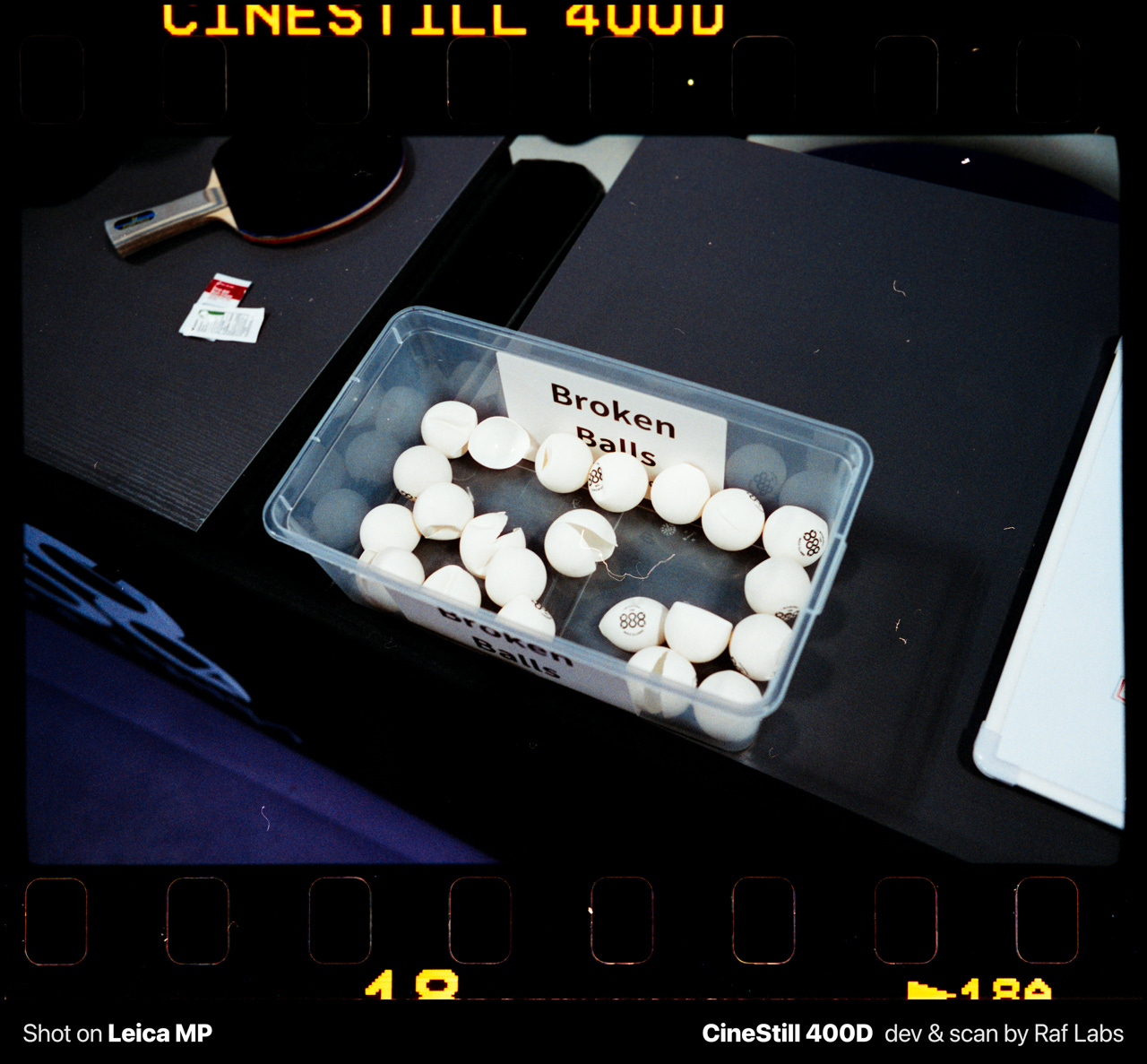 After that day, my friend Leandro and I decided to go play some ping pong, where I got a classic record of what a street photographer does. Rather than paying attention to the professionals playing table tennis (there’s a distinction between ping pong and table tennis — one is casual), the broken balls box caught my attention and I got obsessed with it, spending a couple of film shots.