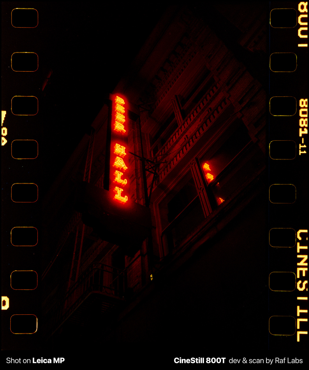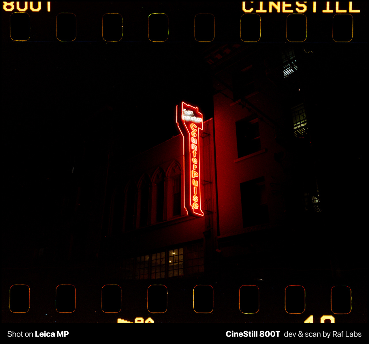 I loaded CineStill 800T on Tuesday night with one goal: capture the neon signs I’d been spotting around San Francisco during the day. Red glowing letters calling out from dark street corners. Light that makes you want to shoot at night.